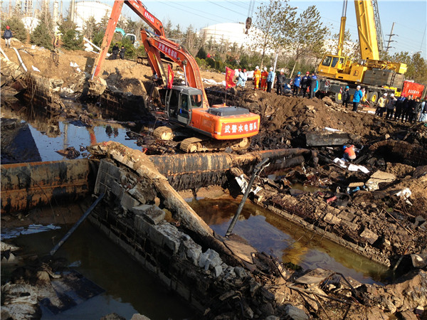 LU: 事故雖然過(guò)去了5年,但許多事情仍然歷歷在目。 2013年11月下旬,我正在日本JFE鋼鐵廠(chǎng)考察訪(fǎng)問(wèn)。 11月23日清晨用餐時(shí),看到日本電視新聞報道中國青島發(fā)生了輸油管道爆炸,感到非常震驚。正要和國內聯(lián)系,就接到國家安監總局打來(lái)的電話(huà),要我盡快趕回國內參加事故調查。我立即中斷考察行程,于當天乘飛機回到北京,晚上抵達青島。我和中國石油大學(xué)于達教授、西南石油大學(xué)李長(cháng)俊教授、石油管工程技術(shù)研究院霍春勇教授分到一個(gè)小組,主要任務(wù)是調查泄漏原因和泄漏量。 24日上午我們乘車(chē)來(lái)到事故現場(chǎng),雖然搜救遇難者和傷員等主要工作已經(jīng)結束,但爆炸所造成的巨大破壞仍然讓人觸目驚心。青島經(jīng)濟開(kāi)發(fā)區秦皇島路和齋堂島街一帶排水暗渠水泥蓋板全部掀翻,橫七豎八散落在居民小區的馬路上。周邊的麗東化工廠(chǎng)、益和電器公司的部分建筑嚴重損毀,滿(mǎn)目瘡痍,讓人心情格外沉重。據事后確認公布,這次事故共造成63人死亡、 156人受傷,直接經(jīng)濟損失75 172萬(wàn)元,F場(chǎng)我們遇到了正在指揮搶險的中石化集團公司傅成玉董事長(cháng)和管道儲運公司錢(qián)建華總經(jīng)理,錢(qián)總向我們簡(jiǎn)單介紹了事故情況后帶我們到東黃復線(xiàn)管道泄漏點(diǎn),調查工作隨即開(kāi)始。