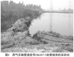 人為活動(dòng)主要是指亂采、 亂挖, 灌溉水下滲、 爆破震動(dòng)等, 對管道安全造成危害。 圖7、 圖8為采砂挖砂后形成的地下水匯聚湖塘, 岸邊距管線(xiàn)近10m, 采砂活動(dòng)一直在進(jìn)行, 岸邊的漸進(jìn)坍塌對管線(xiàn)存在隱患。