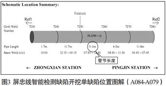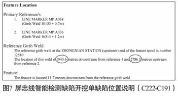 筆者以2008年8月的屏忠線(xiàn)檢測數據生成的一張缺陷開(kāi)挖單舉例做簡(jiǎn)單說(shuō)明。 見(jiàn)圖1, 上游A084號馬克點(diǎn)在6680號環(huán)焊縫下游2.4米處, 下游A079號馬克點(diǎn)在7630號環(huán)焊縫下游6.1米處, 兩點(diǎn)間距為748.2米(495.8米+252.4米) , 上游點(diǎn)距離缺陷點(diǎn)較近的7250焊口495.8米, 下有點(diǎn)距離缺陷點(diǎn)較近的7250焊口252.4米。 那我們使用皮尺從下游點(diǎn)往上游點(diǎn)測量前進(jìn)252.4米, 就是7250焊縫位置, Feature中的“0.0metres”表示缺陷與7250焊縫的距離是0米, 這說(shuō)明缺陷就在焊縫上。