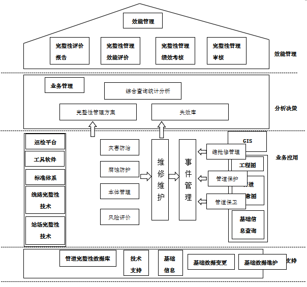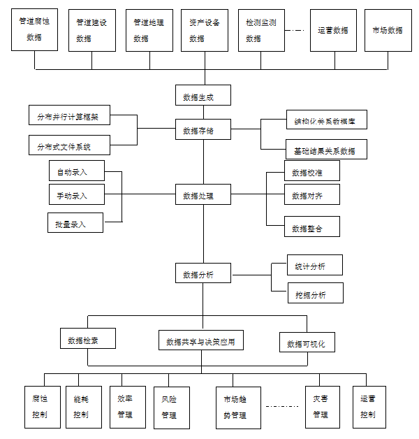 智能化管網(wǎng)系統是一個(gè)龐大的應用工程系統,其將眾多相對獨立的管道數字化,集成化和產(chǎn)品化,整合為以海量數據庫為基礎的系統,實(shí)現數據共享,具有智能化、數字化、可視化、標準化、自動(dòng)化、一體化特征,并具有專(zhuān)業(yè)性、兼容性、共享性、開(kāi)放性、安全性特點(diǎn),最大限度地消除信息孤島。智能化,即實(shí)現管道的運行優(yōu)化、管道安全風(fēng)險的預測預警、應急搶險的交互聯(lián)動(dòng)響應;數字化,即通過(guò)文檔資料及圖片資料的結構化、索引化,加強知識共享,更為設備更新改造提供便捷;可視化,即實(shí)現管道相關(guān)數據的圖形、圖像、視頻、圖表分析信息的多維度查詢(xún)及可視化展示;標準化,即生命周期的業(yè)務(wù)標準、技術(shù)標準、數據標準,以及設計、建設期成果的數字化移交標準;自動(dòng)化,即完善管道的自控儀器儀表、檢測設備及監控系統,實(shí)現管道運行狀態(tài)的自動(dòng)檢測;一體化 ,即全面整合生產(chǎn)運行的實(shí)時(shí)數據和管理應用的業(yè)務(wù)數據,通過(guò)大數據建模分析實(shí)現決策支持。