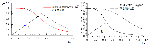 2X60管道完整性評價(jià)曲線(xiàn),缺陷評價(jià)點(diǎn)A的坐標為(0.3205,0.3763),對應的安全系數為1.7367,從圖中可看出,含硫化氫管道評價(jià)曲線(xiàn)安全區域范圍變小。圖3X65鋼管道完整性評價(jià)曲線(xiàn),缺陷評價(jià)點(diǎn)A的坐標為(0.2038,0.2650),對應的安全系數為1.8375,從圖中也可看出,含硫化氫管道評價(jià)曲線(xiàn)安全區域范圍變小。