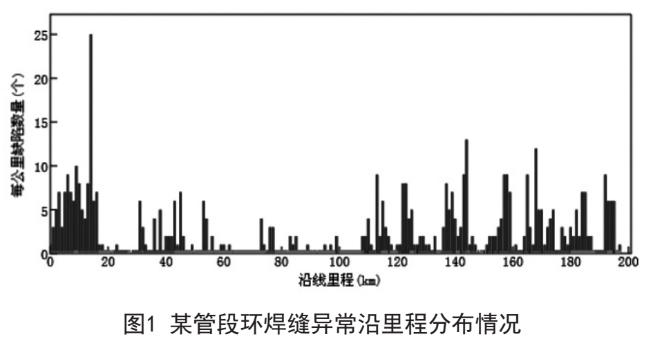 例如:某輸氣管道長(cháng)197km,內檢測共報告異常環(huán)焊縫483處,平均每公里管道有異常焊縫2.5處。但報告僅給出了異常環(huán)焊縫的環(huán)向長(cháng)度和軸向寬度,由于沒(méi)有成熟的風(fēng)險分級原則,導致開(kāi)挖驗證工作缺乏依據。異常環(huán)焊縫沿里程分布情況如圖1所示。