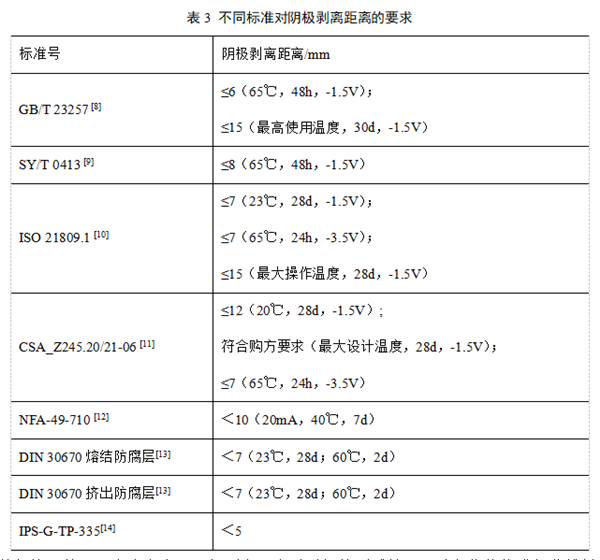 為了根據陰極剝離加速實(shí)驗獲得材料的預期壽命,首先需要確定陰極剝離距離的評價(jià)指標,將國內外相關(guān)標準對陰極剝離距離的具體要求匯總為表3。最高要求是3PE防腐層在最高溫度長(cháng)時(shí)間后陰極剝離距離小于等于15mm。因此,以防腐層剝離距離達到15mm時(shí)的時(shí)間作為防腐層的特征壽命和保守的評價(jià)指標。