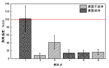 2014年,對已建8年的某輸氣管線(xiàn)進(jìn)行防腐層檢測時(shí),發(fā)現3PE防腐層大面積剝離。經(jīng)現場(chǎng)選取6個(gè)測試點(diǎn)進(jìn)行剝離強度測試,大部分測試點(diǎn)防腐層的剝離強度都小于標準要求的100N/cm[8],如圖1所示。隨后選取現場(chǎng)試驗管段開(kāi)展表面預處理分析、錨紋深度測試、熔結環(huán)氧固化度測試、陰極保護檢測等,查找致使3PE防腐層剝離的關(guān)鍵因素。