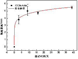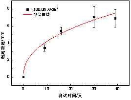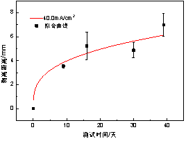 根據建立的陰極剝離預期壽命模型,可以獲得不同電流密度下防腐層剝離距離達到一定值時(shí)的壽命特征(即時(shí)間),在實(shí)際海管陰極保護設計時(shí),可參考此方法,以高電流密度下的壽命特征外推獲得低電流密度下的壽命特征。