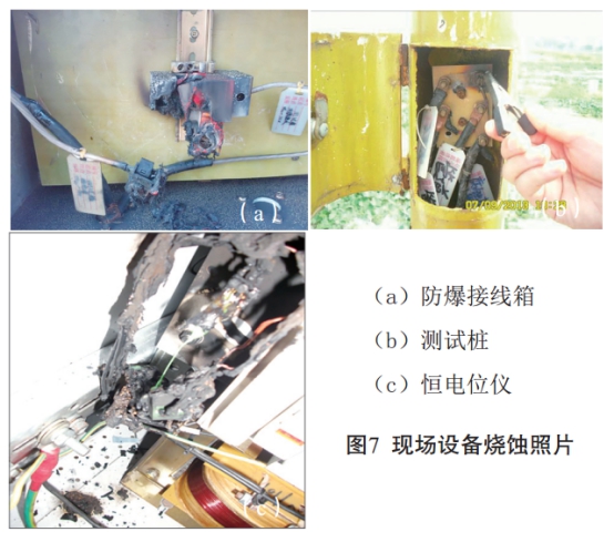 如圖7所示,2013年8月16日,大塘接地極入地電流達1200A,發(fā)現位于接地極外環(huán)連接鋅帶與管道的二極管燒毀;在其他運行時(shí)間里魚(yú)龍嶺接地極和大塘接地極的故障放電燒毀了大量站場(chǎng)相關(guān)設備。