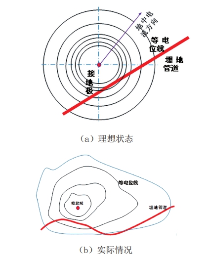 在理想情況下,即在接地極形狀規則、土壤均勻等條件下,如圖6(a)所示,土壤中的等電位線(xiàn)是以接地極為中心的同心圓,由于管道上電位分布不同,電流在土壤高電位點(diǎn)流入管道,在遠處低電位點(diǎn)流出;而在實(shí)際情況下,如圖6(b)所示,管道布局、接地極形狀及埋設方式、環(huán)境變化等參數的復雜性,使得土壤中地電場(chǎng)分布情況難以求解,因此確定實(shí)際情況下管道上電流的流入流出點(diǎn)、計算管中電流以及測定電流密度等都十分困難。