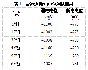 1#集氣站至1#閥室之間的管道采用外加電流陰極保護方式,陰極保護站設在集氣站。在陰保站安裝電流斷續器,并在不同的測試樁位置進(jìn)行通/斷電電位測試,結果見(jiàn)表1。