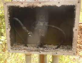 在管道運行中,多次發(fā)生鰲-廣線(xiàn)管道、從化分輸站站內管道及設備陰極保護恒電位儀在未開(kāi)機情況下被燒毀的情況(圖2);鰲頭站、廣州分輸站等四座輸氣站場(chǎng)的進(jìn)出站管道絕緣接頭兩端的5個(gè)等電位連接器也受到強電流的干擾被燒毀(圖3);從化分輸站、三水分輸站的越站閥及線(xiàn)路截斷閥的引壓管絕緣接頭被燒毀(圖4);同時(shí)也發(fā)現BV閥個(gè)別引壓管之間有電弧灼燒痕跡,甚至在BV閥和埋地鋼質(zhì)護管套管之間也存在打火、金屬附屬設施被電弧熔接到一起的情況(圖5)。據分析,發(fā)生恒電位儀燒毀的原因,是大地內流入電流超過(guò)恒電位儀元器件額定參數,使元器件產(chǎn)生過(guò)熱現象。發(fā)生打火、熔接現象,是接地極放電時(shí),輸氣管道的電位升高(或者降低),由于絕緣接頭的存在,絕緣接頭兩端管道或者管道與本地設備之間形成高的電壓差,在兩者距離接近的情況下產(chǎn)生電弧。