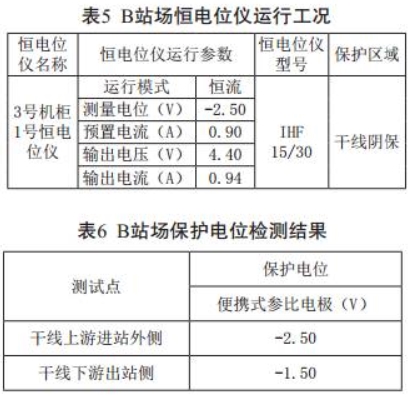 對B站場(chǎng)恒電位儀的運行工況及保護電位進(jìn)行了檢測,結果見(jiàn)表5、表6。