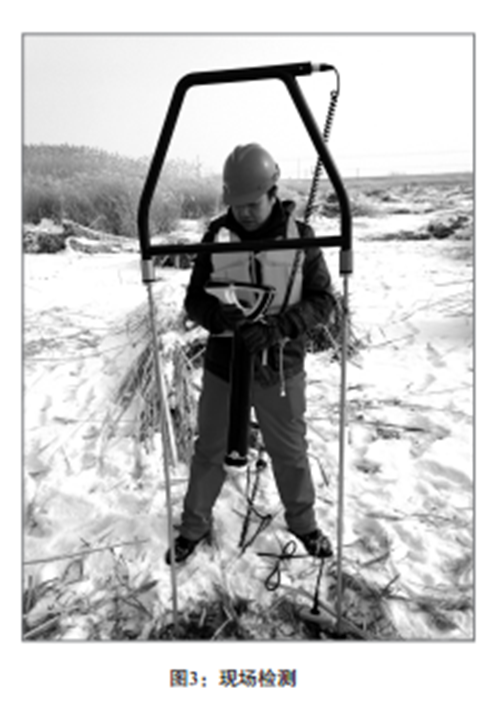 本次檢測采用DM內外業(yè)一體化型管道防腐 層檢測系統,分區段選擇測試樁84Km及88Km做為施加信號點(diǎn),信號頻率為: 3Hz+6Hz+128Hz;電流強度為2A。檢測人員將A字架下方探腳分別連接2根2米長(cháng)的鍍鋅鋼質(zhì)套管延長(cháng)桿,以保證A字架探腳能夠穿透冰層與管道上方土壤良好接觸;并在套管中穿入銅絲以保證其良好的導電效果。(見(jiàn)圖1)