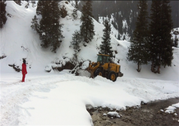 隨著(zhù)深入果子溝腹地,積雪越來(lái)越厚,至4B隧道出口坡道下方時(shí),積雪接近1米,伴行路靠山一側積雪達到1.8~2.0米,挖掘機無(wú)法進(jìn)行壓雪,直至4B隧道出口的坡道,只能在坡道挖雪前進(jìn),挖雪速度為0.33米/分鐘。