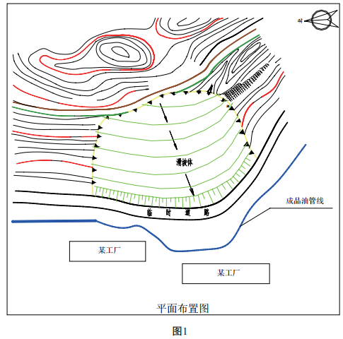 廣東順德某成品油管道繞飛鵝山腳呈等高線(xiàn)敷設。 2008年6月30日, 由于受連續多天強降雨的惡劣天氣影響, 山腰出現多處裂縫, 裂縫的寬度和數量不斷擴大和增多, 山腳已開(kāi)始形成小面積的滑坡。 管道前方的廠(chǎng)房建筑物出現大面積開(kāi)裂和倒塌。 經(jīng)初步測量, 滑坡體積約為3萬(wàn)立方, 滑坡面處于管道上方約12米的位置, 滑坡體腳址位于管道前20米位置, 若不快速采取有效措施, 滑坡體下滑的外力將加劇對成品油管道的推移,導致管道變形、 斷裂和成品油大量泄漏, 危及周?chē)罕娚敭a(chǎn)安全, 破壞周邊的生態(tài)環(huán)境。 (見(jiàn)圖 1)