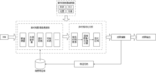 管道隱患自動(dòng)/半自動(dòng)提取流程如圖2所示。根據數據源的不同,隱患提取分為兩種方式。針對單時(shí)相影像,利用隱患特征庫中的隱患特征在圖中尋找管道裸露、水閥室損害、堡坎坍塌等管道及附屬設施隱患。針對多時(shí)相影像,將前后兩時(shí)相分別進(jìn)行配準、圖像差值/比值計算,然后提取變化點(diǎn),編輯變化檢測結果,去除偽變化,最終得到各類(lèi)新增隱患。