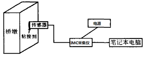 橋墩振動(dòng)加速度動(dòng)態(tài)監測系統由三軸加速度傳感器、多通道高速數據采集儀(IMC數據采集儀)、數據分析軟件、蓄電池和終端電腦組成。三軸加速度傳感器將管道振動(dòng)引起的電容變化轉變?yōu)殡妷盒盘,由IMC數據采集儀經(jīng)濾波、放大、數據處理?yè)Q算為加速度值,在終端電腦上用數據分析軟件還原成圖形和數值。