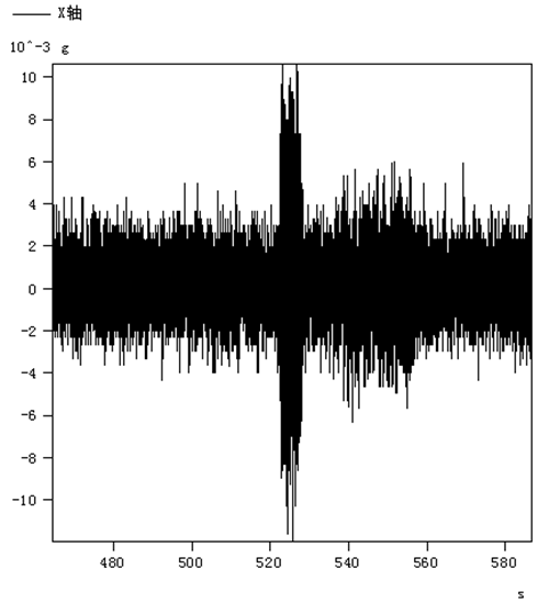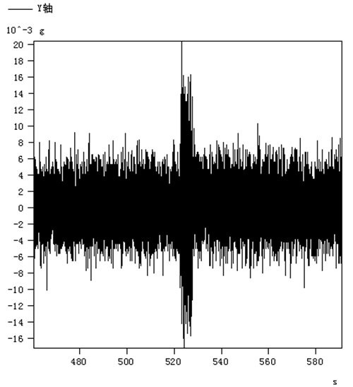 當正上方有車(chē)經(jīng)過(guò)時(shí),安裝在1號橋墩的加速度傳感器三軸方向都測到了明顯波形,在為期7天的連續監測中,測到一組最大振動(dòng)加速度值,三軸最大值分別為:X軸:0.011 g;Y軸:0.020 g;Z軸:0.009 g(監測時(shí)間:3月26日 17:09,此時(shí)段經(jīng)過(guò)G71車(chē)次,列車(chē)為進(jìn)站方向)。三軸的波形如圖5~7所示。