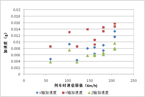 圖8 列車(chē)時(shí)速與振動(dòng)加速度峰值關(guān)系