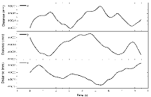 通過(guò)對圖5~7進(jìn)行分析,可以發(fā)現列車(chē)經(jīng)過(guò)時(shí),橋墩的三個(gè)方向均產(chǎn)生了較為明顯的振動(dòng)。對產(chǎn)生明顯振動(dòng)的曲線(xiàn)段進(jìn)行FFT去噪,得到圖9所示的加速度曲線(xiàn)。