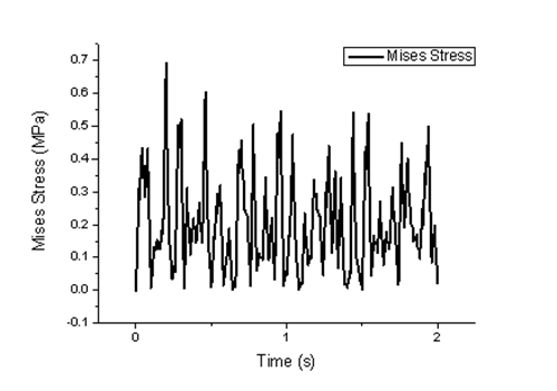 圖16、17中的P點(diǎn)為振動(dòng)中心,其振動(dòng)強度最大。P點(diǎn)處的米塞斯等效應力場(chǎng)的變化曲線(xiàn)如圖18所示。從曲線(xiàn)可以看到,管道振動(dòng)時(shí)等效應力呈波浪狀變化,最大可以達到0.5 MPa。
