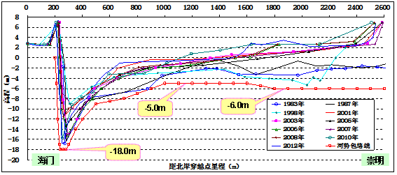 圖2 長(cháng)江口北支輸氣管道穿江工程斷面歷史最大水深包絡(luò )線(xiàn)分析