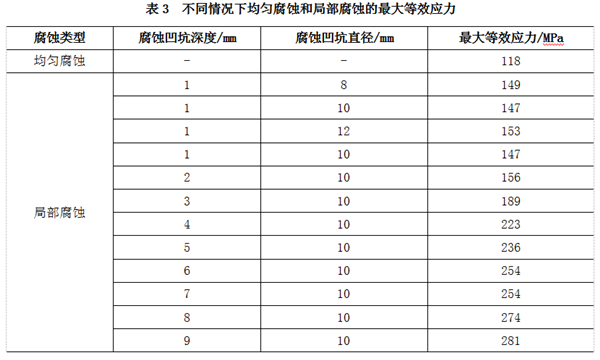 由表3可知,在4.75 MPa操作壓力下,腐蝕凹坑直徑為10 mm,腐蝕深度為1—5 mm時(shí),平管局部腐蝕受力最大為L(cháng)d=236 MPa, Rd=273.6 MPa,Ld<Rd。說(shuō)明管道符合安全標準。