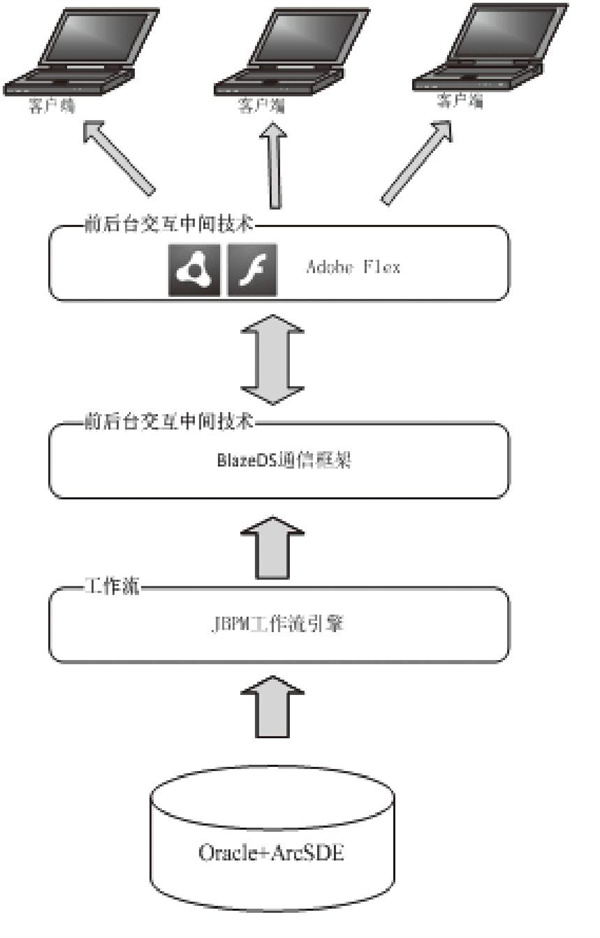 水工保護數據管理系統采用Flex技術(shù)作為表現層,通過(guò)BlazeDS框架實(shí)現前后臺的數據通信,以JBPM工作流引擎為基礎實(shí)現水工數據的錄入審核,通過(guò)Oracle和ArcSDE管理屬性數據空間數據,系統總體架構如圖1所示。