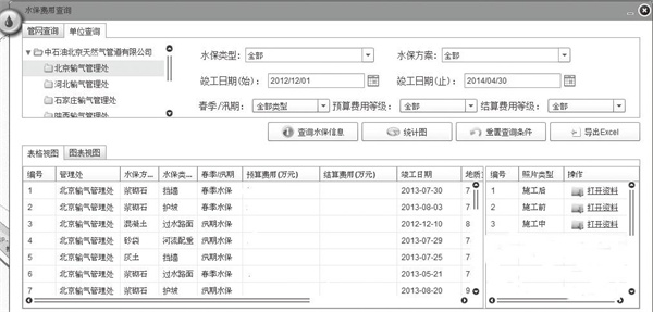 本文根據長(cháng)輸油氣管道的水工保護數據管理分析的應用需求,采用基于富客戶(hù)端技術(shù)的FlewViewer框架開(kāi)發(fā)水工保護數據管理GIS系統。以管道完整性數據模型為基礎將用戶(hù)提交的水保數據錄入至數據庫中,并生成水工保護空間圖形,建立水保工程現場(chǎng)照片與相應數據之間的關(guān)聯(lián)關(guān)系,實(shí)現了水工保護數據的規范錄入和科學(xué)管理。同時(shí)開(kāi)發(fā)了水工保護數據查詢(xún)與分析模塊,以表格和統計圖的形式快速準確、直觀(guān)、多角度的展示水工保護數據的空間分布和費用投入情況, 并實(shí)現了對歷史數據的多樣化信息統計與分析,為合理調配資源、科學(xué)管理工程實(shí)施、避免資源浪費提供了輔助決策信息。◢