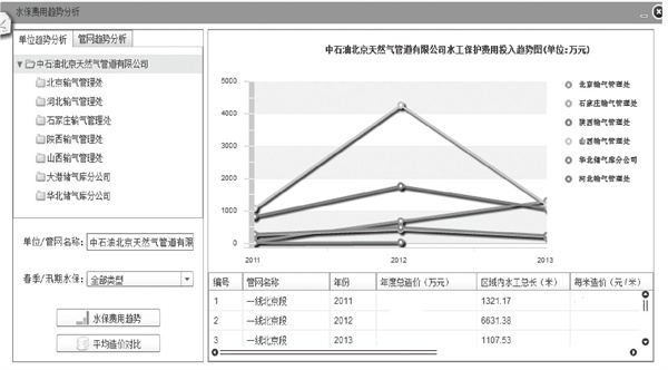 該模塊以管理單位、管線(xiàn)為分析依據, 展示水工保護費用歷年的投入情況,同時(shí)統計管線(xiàn)1公里、10公里、50公里、100公里的平均水保工程造價(jià),如圖6所示。