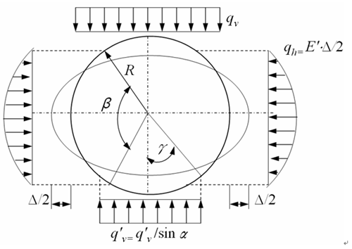 Spangler-Iowa方法管道示意如圖 2所示,作用于管頂的垂直載荷按均布載荷考慮,其分布寬度與管道外徑相同。管底承受地基垂直反力,均勻作用于圓心角2γ,管側承受土壤彈性抗力,其強度為二次拋物線(xiàn)規律分布,作用范圍對應圓心角β,最大抗力qh位于水平直徑的兩端。