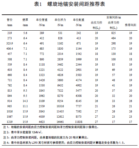 通過(guò)對不同的材質(zhì)、管徑及壁厚進(jìn)行計算可以得出,管徑較小時(shí)(<1016mm),安裝間距由應力控制,管徑較大時(shí)(≥1016mm),安裝間距由浮力控制;材質(zhì)及壁厚對其影響不大。