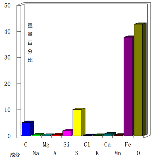 能譜分析顯示該樣品主要由 O、Fe、S、C元素組成,含少量 Ca、Mg、Al、Si、Na、Mn等,衍射資料顯示主要物質(zhì)為鐵的氧化物和硫,含少量石英、粘土礦物和方解石等,推測含有鐵的硫化物和有機物(見(jiàn)圖3)。