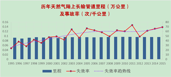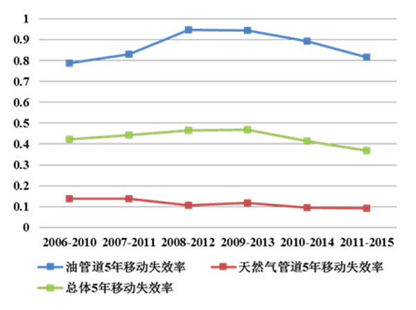 近年來(lái),美國油品管道年失效頻率保持在0.4—0.6次/103 km•a(圖1),天然氣管道年失效頻率由0.04次/ 103 km•a振蕩攀升至0.14次/ 103 km•a(圖2)。