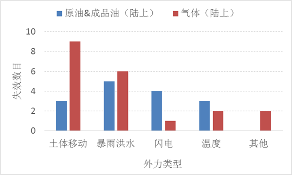 (5)國內外因自然與地質(zhì)災害導致管道失效的比例(占整體失效)相當,其中主要因素均為暴雨洪水和土體移動(dòng)。