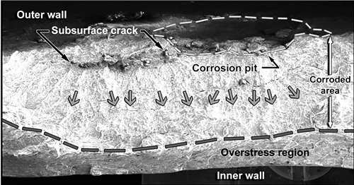 管道破裂點(diǎn)位于直焊縫附近,裂紋由腐蝕坑底部發(fā)展,下圖為事件管段電子顯微鏡圖片。
