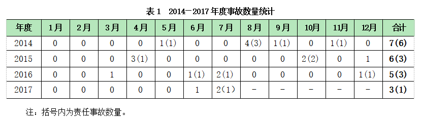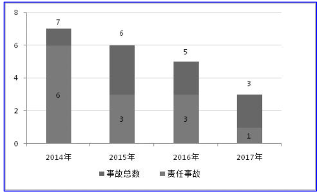 通過(guò)實(shí)施標準化站隊建設工作,2014年至2017年公司生產(chǎn)安全責任事故、較大影響生產(chǎn)安全事件發(fā)生起數逐年下降,分別見(jiàn)表1、圖1。