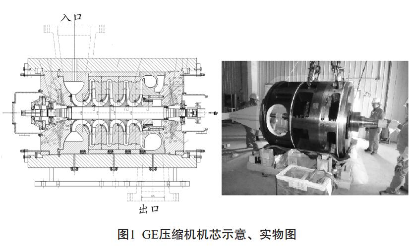 機殼為鍛造機殼,桶式結構,在壓縮機機芯上制作了進(jìn)出口蝸殼,與壓縮機的進(jìn)出口法蘭孔相對應,如圖1所示。因此,壓縮機進(jìn)出口法蘭中心線(xiàn)不在同一條直線(xiàn)上,且壓縮機進(jìn)出口軸線(xiàn)間的距離因壓縮機機芯的不同而不同。壓縮機的外殼長(cháng)度也不相同。所以,在對壓縮機機芯進(jìn)行改造時(shí),需要考慮這個(gè)尺寸。一般情況下,不適宜對其進(jìn)行增加葉輪的改型。