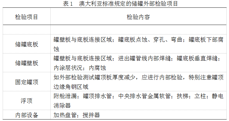 該標準規定儲罐應優(yōu)先進(jìn)行外部檢驗,根據外觀(guān)檢驗結果確定是否維修,以及是否進(jìn)行內部檢驗,外部檢驗項目見(jiàn)表1。