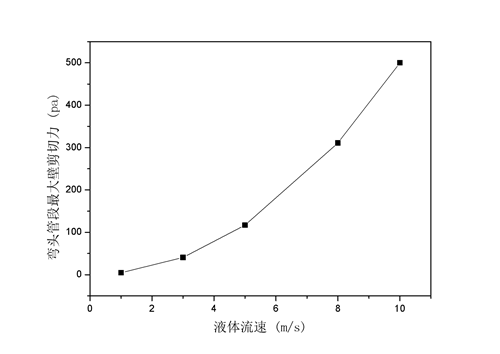 圖5 彎管管壁最大剪切力隨液體流速變化趨勢