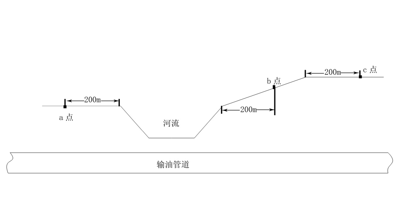 圖2是管道兩側地勢高差一側低,一側高的情況,高后果區邊界正常設定在b、c兩點(diǎn),其中b點(diǎn)滿(mǎn)足在管道泄漏后,油流可以克服阻力逆向流入河流中的最遠距離,由于確認b點(diǎn)需要考慮較多因素,確認難度較大,出于安全范圍考慮,建議選擇a點(diǎn)、b點(diǎn)。