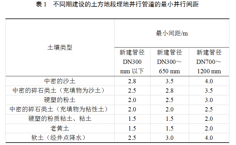 (4)不同期建設時(shí),土方地段埋地并行管道的最小并行間距見(jiàn)表1。