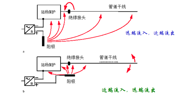 站內區域陰極保護電流一般通過(guò)影響站外干線(xiàn)陰極保護系統控制點(diǎn)來(lái)對其造成干擾。由于國內大多數管道干線(xiàn)陰極保護系統采用恒電位控制方式,而控制點(diǎn)(通電點(diǎn))通常設在絕緣接頭或絕緣法蘭外側,當該處管道受到外來(lái)干擾時(shí),由于附加極化或去極化而影響控制系統的信號反饋,使站外保護系統的輸出降低或增加,干線(xiàn)保護相應受到影響。通常有兩種類(lèi)型:一是控制點(diǎn)處有干擾電流流入,導致極化增加,如圖 1(a)所示,為維持設定的控制電位,干線(xiàn)陰極保護系統輸出將自動(dòng)下降,導致整個(gè)管道陰極極化降低,遠端易保護不足。二是控制點(diǎn)處有干擾電流流出,導致極化減小,如圖 1(b)所示,為維持設定的控制電位,干線(xiàn)陰極保護系統輸出將自動(dòng)提高,導致整個(gè)管道陰極極化加大,近端易產(chǎn)生過(guò)保護。