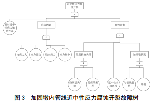 近中性應力腐蝕開(kāi)裂故障樹(shù)如圖 3所示。腐蝕開(kāi)裂主要受管道材質(zhì)、應力和腐蝕三個(gè)因素共同影響。管材、應力、加固墩狀況、防腐層失效、近中性土壤環(huán)境均屬不可控因素,可控制因素只有陰保措施。需定期監測管道陰極保護,發(fā)現異常及時(shí)分析原因并處置,同時(shí)可采用裂紋型內檢測方法監控。