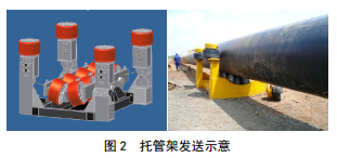采用托管架發(fā)送道時(shí)需要管道滿(mǎn)足彎曲曲率,并能順利進(jìn)入鉆孔。托管架的強度、剛度和穩定性除在預制過(guò)程中滿(mǎn)足設計要求外,還應在現場(chǎng)安裝過(guò)程中保證托管架基礎的穩定性,在送管過(guò)程中,托管架不能傾倒,托管架傾倒可能損傷管道防腐層,甚至出現卡管,回拖無(wú)法進(jìn)行(圖 2)。