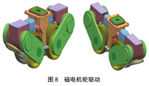 掃描探傷儀通過(guò)磁電機輪驅動(dòng)模塊沿任意路徑移動(dòng),磁模塊基于稀土永磁體,具有高殘留感應磁場(chǎng),鐵磁表面產(chǎn)生61.22 kg (600 N)的拉力,傳感器內置于模塊中,用于感應“輪面”輪廓的磁場(chǎng)強度,允許從鐵磁表面記錄車(chē)輪分離扭矩,如圖 8所示。