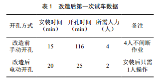 改 造 完 成 后 第 一 次 試 車(chē) , 采 用 管 徑Φ 660 mm×22 mm、 X60管道,壓力0 MPa,設備打壓3 MPa,穩壓20 min無(wú)泄漏。使用75 mm筒刀進(jìn)行開(kāi)孔測試。開(kāi)孔機安裝時(shí)間20 min,開(kāi)孔時(shí)間25 min。開(kāi)孔過(guò)程中測試電機溫度為48 ℃。未出現動(dòng)力不足、卡刀等異,F象,電機工作溫度穩定,各項指標完全符合原開(kāi)孔機各項技術(shù)指標要求和作業(yè)標準(表 1)。