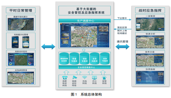管道空間安全系統總體框架見(jiàn)圖 1,平時(shí)日常管理,實(shí)現數據可視化展示、風(fēng)險數字化管理、風(fēng)險動(dòng)態(tài)監控及應急桌面推演等功能;戰時(shí)應急指揮,實(shí)現APP一鍵報警、快速分析、事件分級、協(xié)同指揮等。