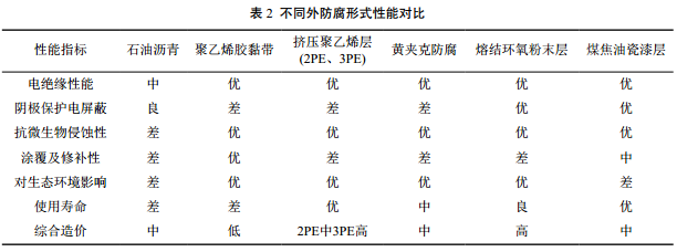 (2)外防腐及陰極保護選擇。調研分析6種防腐形式,性能對比見(jiàn)表 2。
