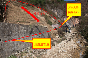 某線(xiàn)性工程選線(xiàn)時(shí)只注重局部地質(zhì)條件的分析而忽略了對區域地質(zhì)背景的把握,線(xiàn)路沿大的斷裂破碎帶敷設,致使線(xiàn)路建成后災害不斷,給其安全運營(yíng)造成嚴重的威脅和巨大的經(jīng)濟損失。再如蘭成渝管道萬(wàn)家大梁隧道出口位置選擇不當,導致滑坡對運營(yíng)管道產(chǎn)生嚴重危害(圖 4)。