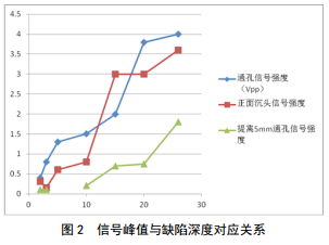 可以看出,檢測信號峰值與缺陷尺寸、類(lèi)型均呈非線(xiàn)性增長(cháng)變化(圖 2)。其主要原因是,一定磁能積的永磁體所構成的磁相互作用空間有限,超出這一空間,所引起的磁擾動(dòng)量減小。另外,檢測信號對探頭提離高度變化敏感,易于產(chǎn)生抖動(dòng)噪音[6],因此有必要在兩個(gè)探頭間進(jìn)行差動(dòng)處理。