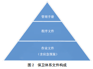 (2)保衛工作體系文件。遵循符合性、可操作性、可檢查性和唯一性的原則,包括管理手冊、程序文件、作業(yè)文件三個(gè)層級,如圖 2所示。管理手冊:明確保衛管理理念、方針、原則和目標,明確相關(guān)組織、人員在開(kāi)展管理活動(dòng)中的職責和要求,是指導工作的綱領(lǐng)。程序文件:為保證方針、目標的實(shí)現,規范公司各級安保管理活動(dòng)的文件;以風(fēng)險管理為主線(xiàn),對安保風(fēng)險進(jìn)行辨識、評估,并策劃風(fēng)險處置方案,明確誰(shuí)做,做什么,做到什么程度等內容。作業(yè)文件:是程序的支持性文件,提供了具體操作指南。